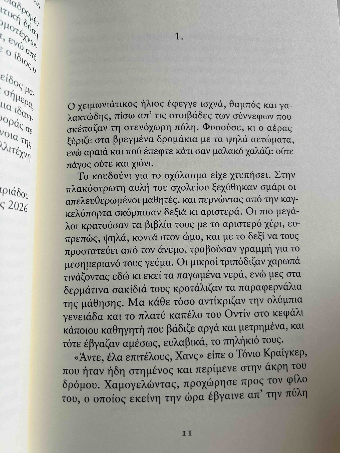 «Άντε, έλα επιτέλους, Χανς» είπε ο Τόνιο Κραίγκερ, που ήταν ήδη στημένος και περίμενε στην άκρη του δρόμου. Χαμογελώντας, προχώρησε προς τον φίλο του, ο οποίος εκείνη την ώρα έβγαινε απ’ την πύλη κουβεντιάζοντας με άλλους συμμαθητές και με πρόθεση να συνεχίσουν όλοι μαζί παρέα. «Τι; Γιατί;» ρώτησε εκείνος και κοίταξε τον Τόνιο. «Α, ναι, σωστά! Πάμε να περπατήσουμε μαζί λιγάκι.»